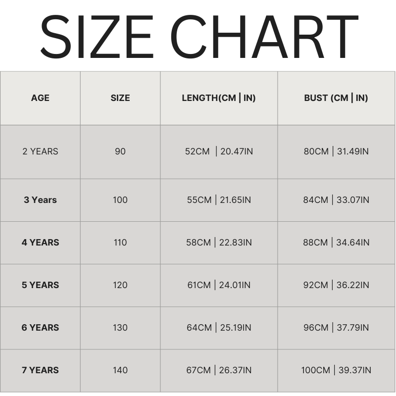 • Verfügbare Größen: 90 (2 Jahre), 100 (3 Jahre), 110 (4 Jahre), 120 (5 Jahre), 130 (6 Jahre), 140 (7 Jahre)